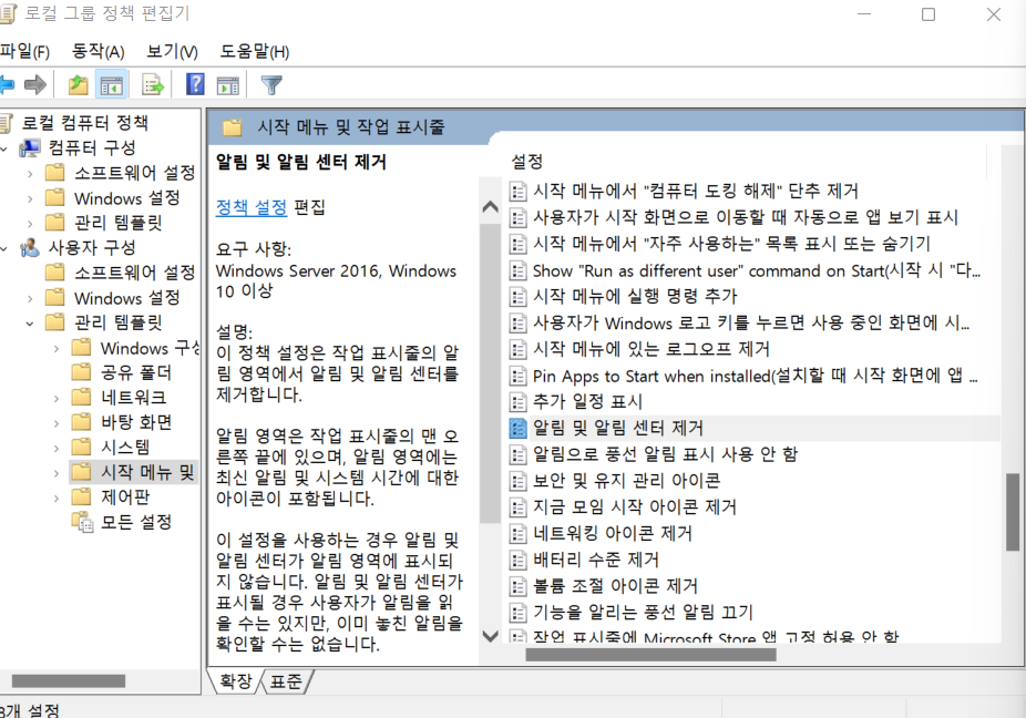 위의 그림처럼, 사용자구성 - 관리 템플릿 - 시작메뉴 및 작업표시줄 - 알림 및 알림 센터 제거로 들어갑니다.